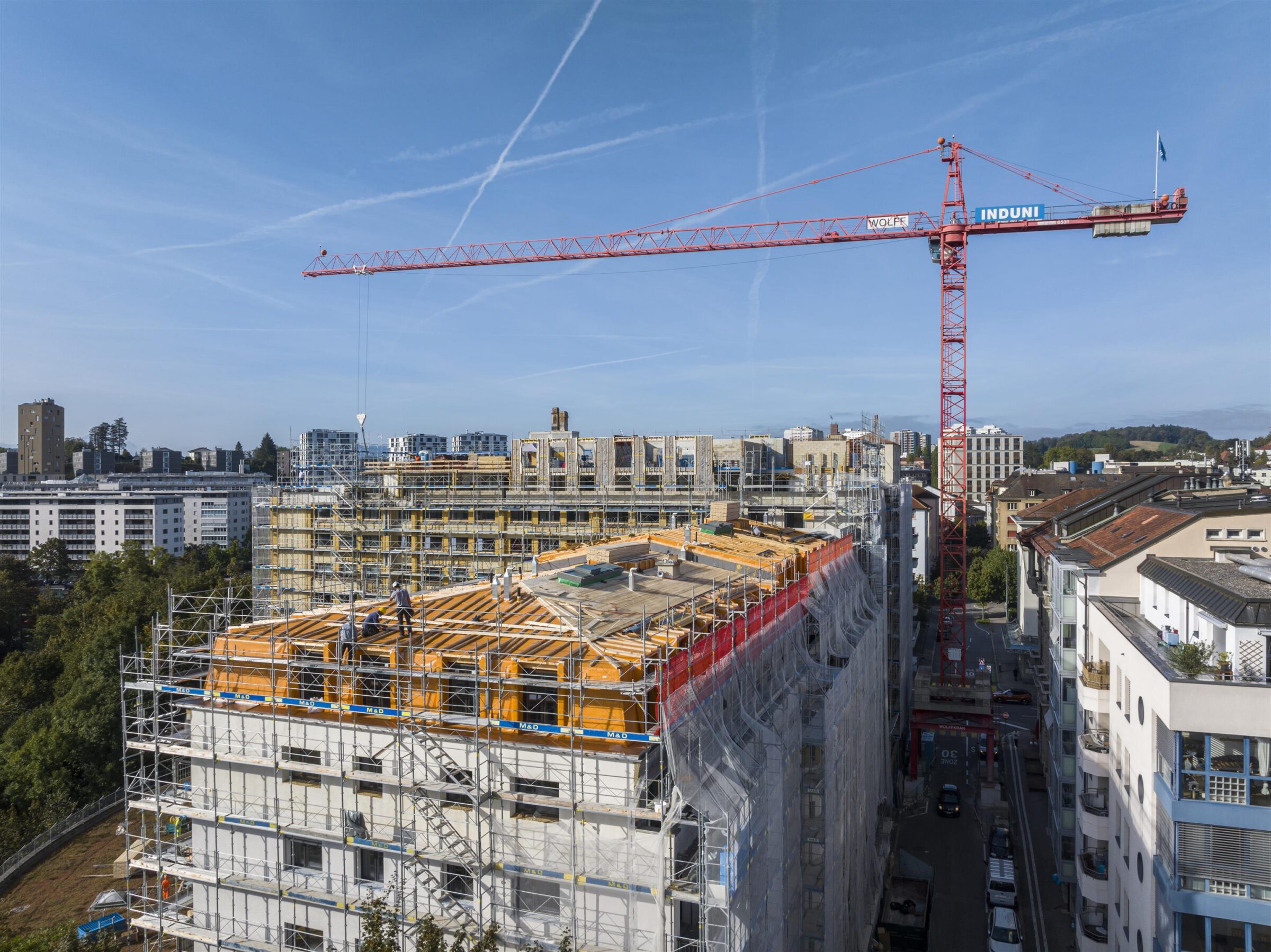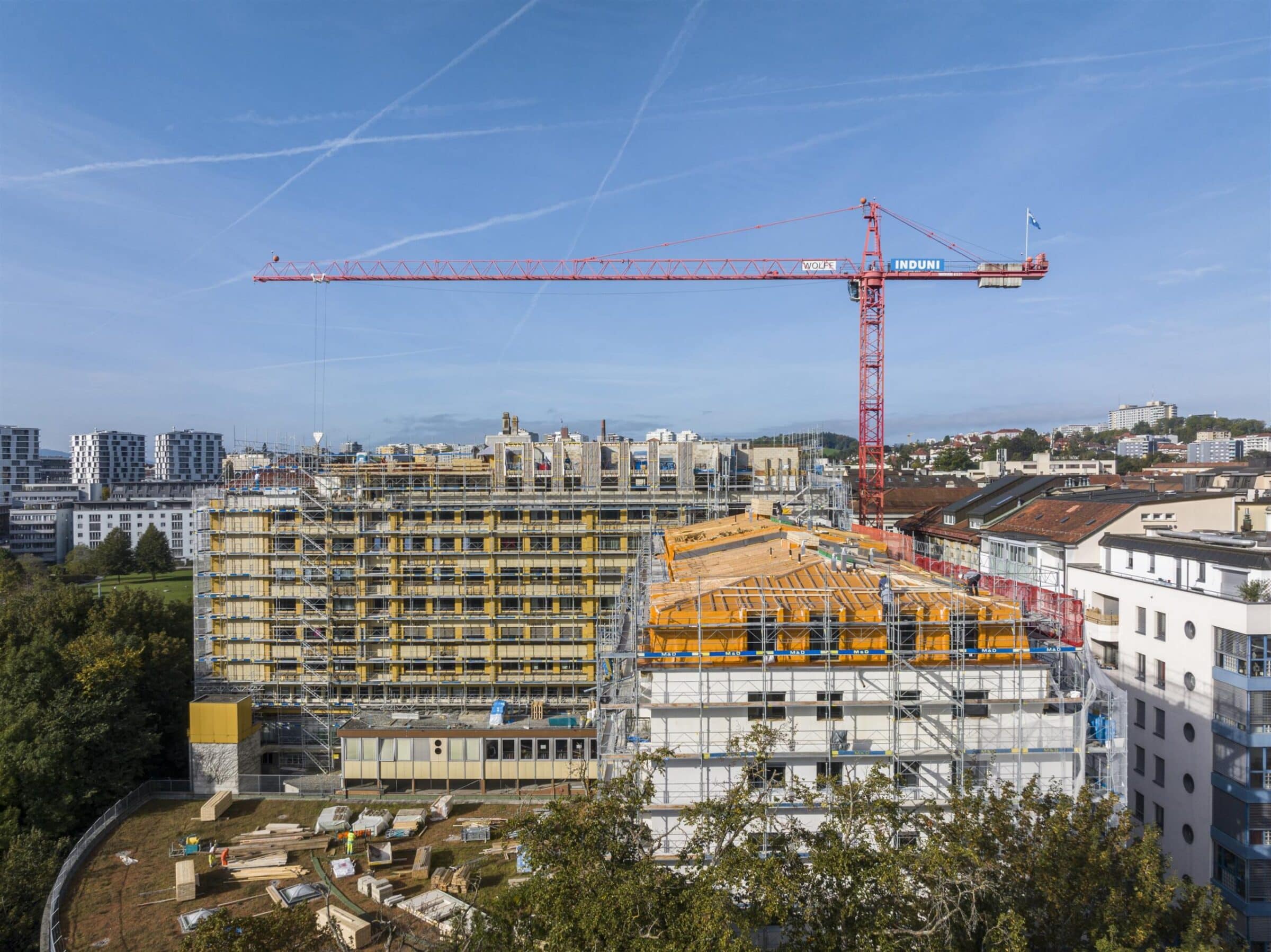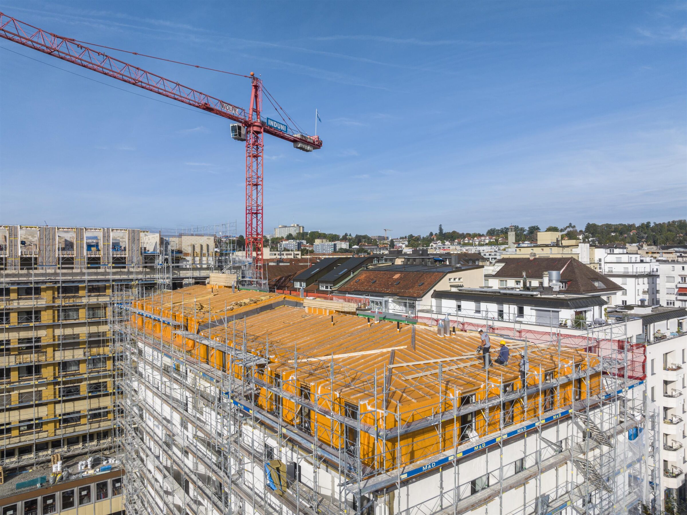 Ce chantier de surélévation s’est déroulé en plein centre de Fribourg, dans un quartier très dense et animé.Mix bois/béton avec rehausse des noyaux principaux en béton armé (cages d’escaliers, murs de refend et gaines d’ascenseurs), puis la pose d’ossatures bois.