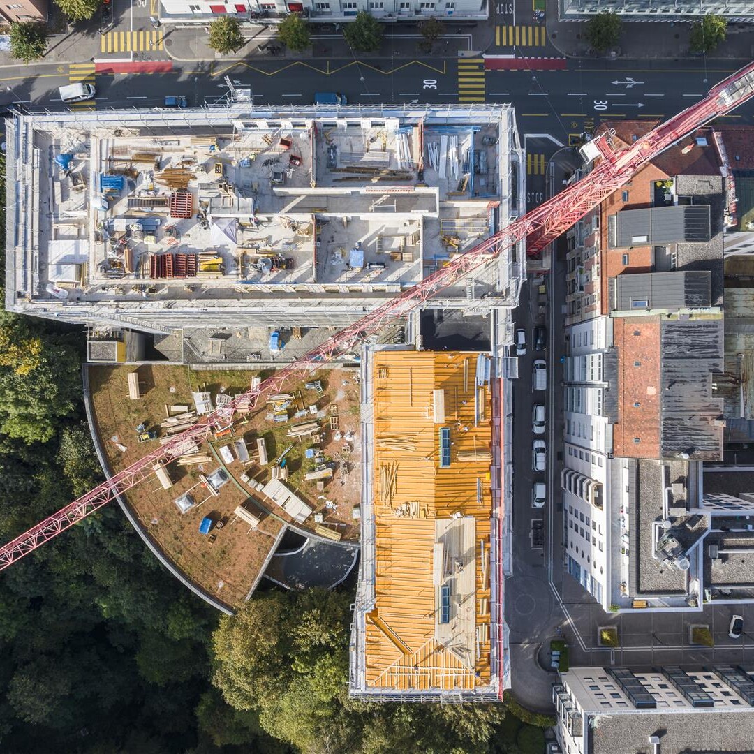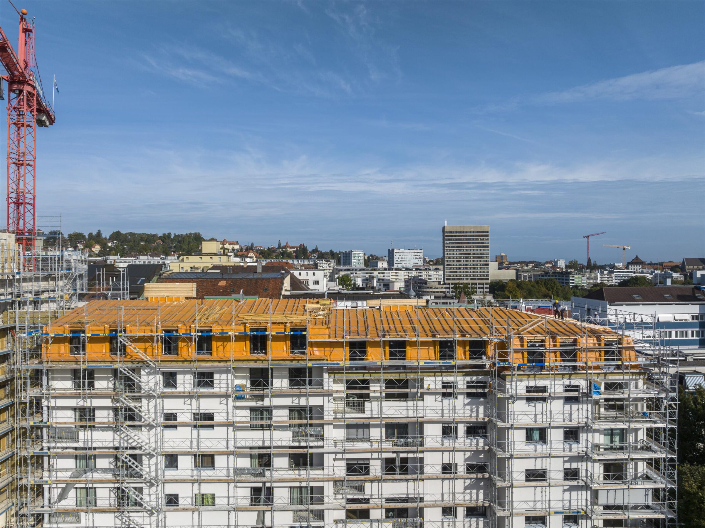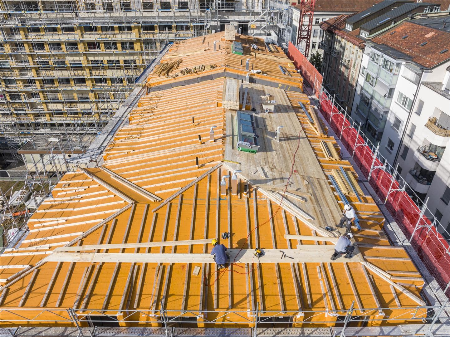 Ce chantier de surélévation s’est déroulé en plein centre de Fribourg, dans un quartier très dense et animé.Mix bois/béton avec rehausse des noyaux principaux en béton armé (cages d’escaliers, murs de refend et gaines d’ascenseurs), puis la pose d’ossatures bois.