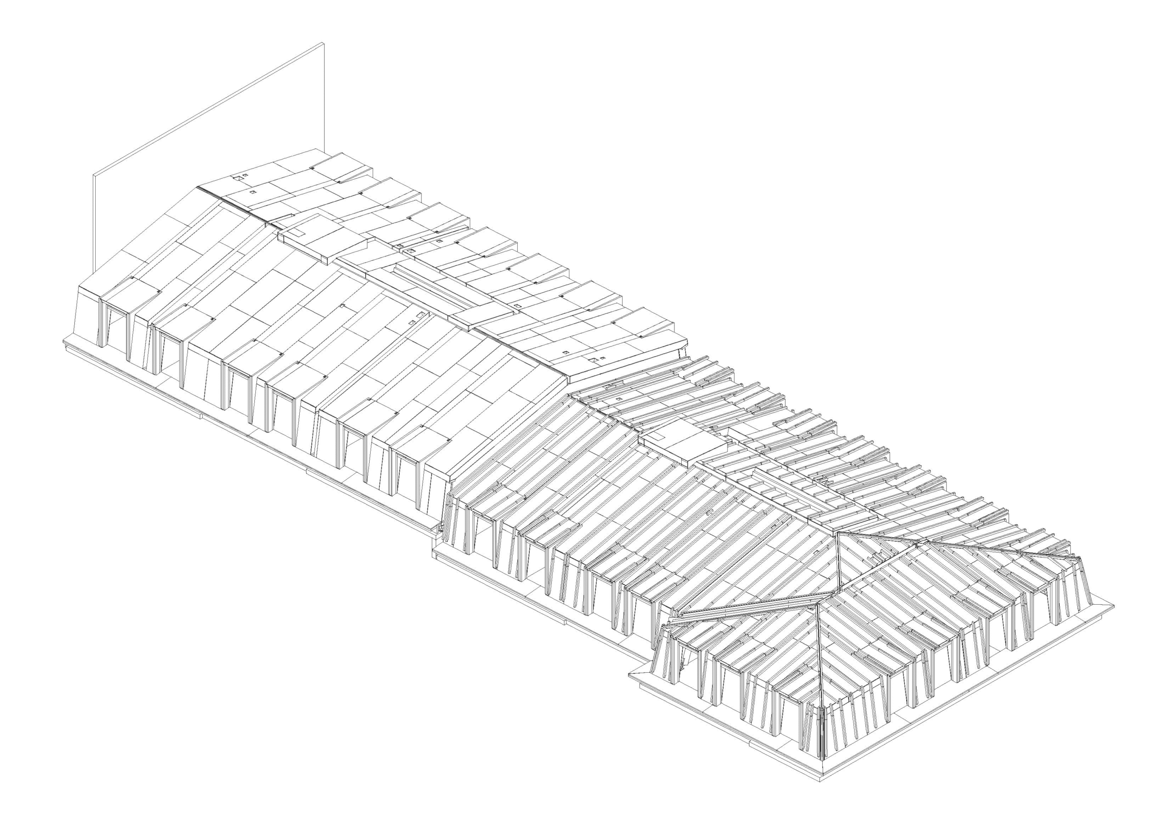 Ces mêmes caissons font aussi office de toiture en pente, fixés à l’aide de cornières sur porteurs en béton.